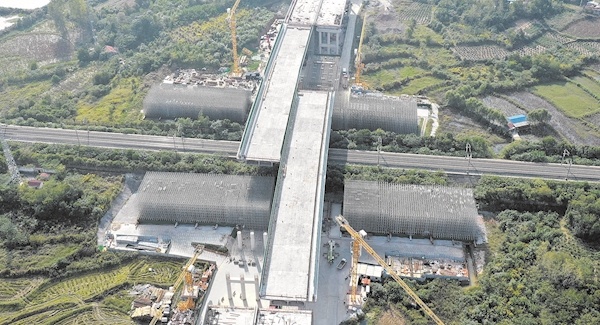 由于两根总重约1.6万吨的托特形梁在夜间同步开启,用时72分钟准确旋转到位,成功跨越沪蓉铁路上下线,实现空中顺利对接,为年底节点竣工打下坚实基础。