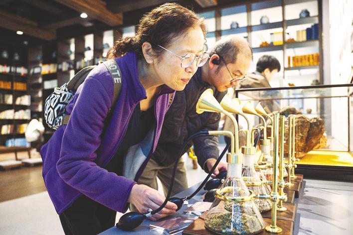 10月24日,市民在叶开泰中医药文化博物馆感受到中草药的香味。当天,叶开泰中医药文化博物馆经过一年的修缮,焕然一新。它既延续了老字号的历史遗风,又展现了跨界转型的现代气魄,成为武汉民俗文化体验的新地标。 (湖北日报全媒体记者 任勇 通讯员 商地双 摄)